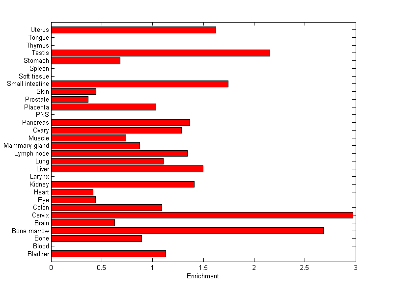 The expression level is normalized with tissue-library size. Each value for a gene in a tissue is a ratio of observed ESTs to the expected one in this tissue. The expected number of ESTs is the product of total ESTs of the gene and the fraction of total ESTs in the tissue among all ESTs in 30 tissues.