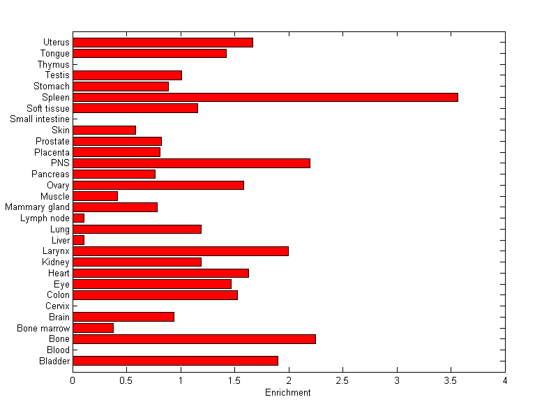 The expression level is normalized with tissue-library size. Each value for a gene in a tissue is a ratio of observed ESTs to the expected one in this tissue. The expected number of ESTs is the product of total ESTs of the gene and the fraction of total ESTs in the tissue among all ESTs in 30 tissues.