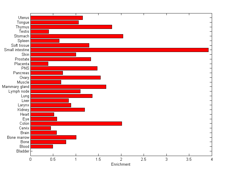 The expression level is normalized with tissue-library size. Each value for a gene in a tissue is a ratio of observed ESTs to the expected one in this tissue. The expected number of ESTs is the product of total ESTs of the gene and the fraction of total ESTs in the tissue among all ESTs in 30 tissues.