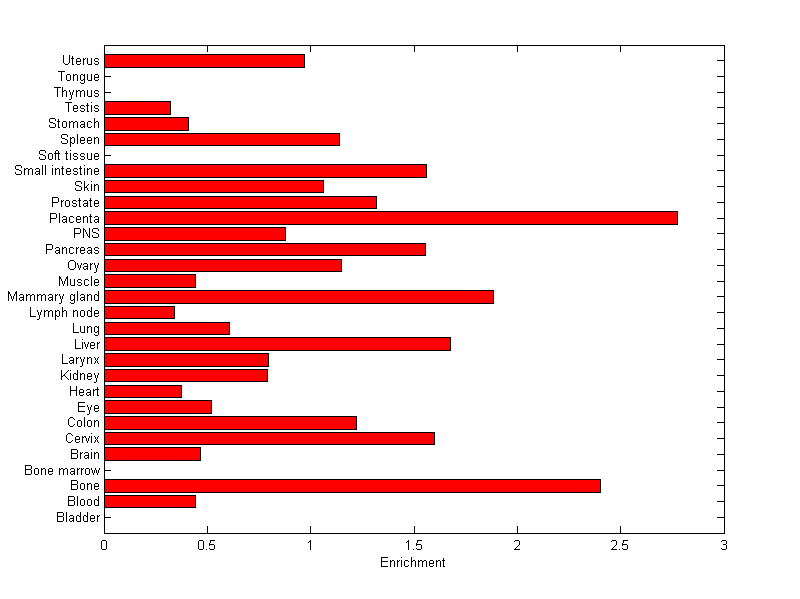 The expression level is normalized with tissue-library size. Each value for a gene in a tissue is a ratio of observed ESTs to the expected one in this tissue. The expected number of ESTs is the product of total ESTs of the gene and the fraction of total ESTs in the tissue among all ESTs in 30 tissues.