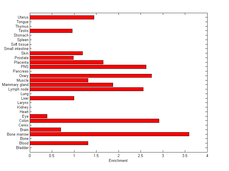 The expression level is normalized with tissue-library size. Each value for a gene in a tissue is a ratio of observed ESTs to the expected one in this tissue. The expected number of ESTs is the product of total ESTs of the gene and the fraction of total ESTs in the tissue among all ESTs in 30 tissues.