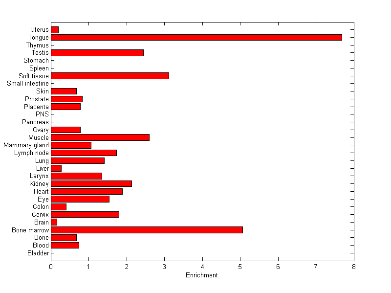The expression level is normalized with tissue-library size. Each value for a gene in a tissue is a ratio of observed ESTs to the expected one in this tissue. The expected number of ESTs is the product of total ESTs of the gene and the fraction of total ESTs in the tissue among all ESTs in 30 tissues.