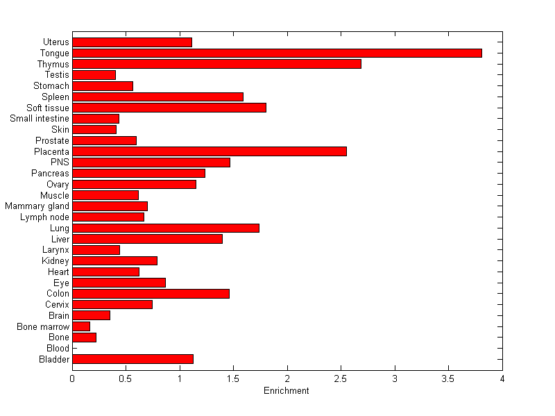 The expression level is normalized with tissue-library size. Each value for a gene in a tissue is a ratio of observed ESTs to the expected one in this tissue. The expected number of ESTs is the product of total ESTs of the gene and the fraction of total ESTs in the tissue among all ESTs in 30 tissues.