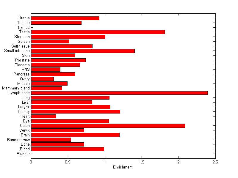 The expression level is normalized with tissue-library size. Each value for a gene in a tissue is a ratio of observed ESTs to the expected one in this tissue. The expected number of ESTs is the product of total ESTs of the gene and the fraction of total ESTs in the tissue among all ESTs in 30 tissues.