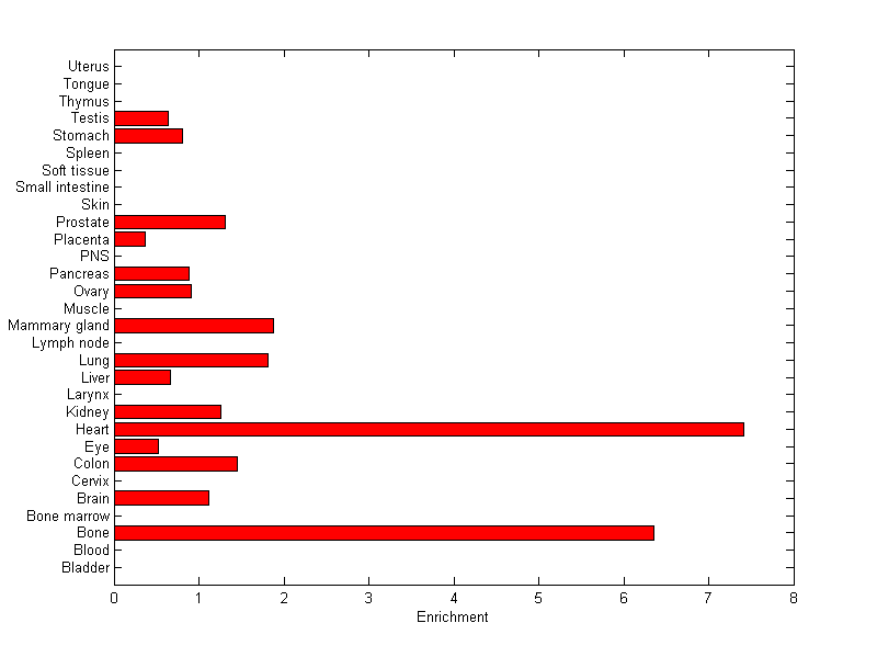 The expression level is normalized with tissue-library size. Each value for a gene in a tissue is a ratio of observed ESTs to the expected one in this tissue. The expected number of ESTs is the product of total ESTs of the gene and the fraction of total ESTs in the tissue among all ESTs in 30 tissues.