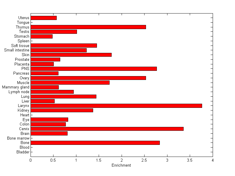 The expression level is normalized with tissue-library size. Each value for a gene in a tissue is a ratio of observed ESTs to the expected one in this tissue. The expected number of ESTs is the product of total ESTs of the gene and the fraction of total ESTs in the tissue among all ESTs in 30 tissues.