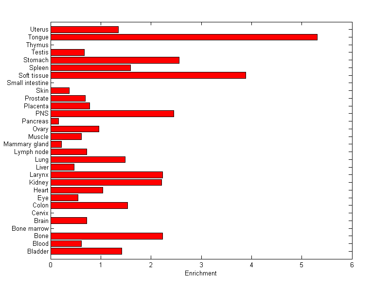 The expression level is normalized with tissue-library size. Each value for a gene in a tissue is a ratio of observed ESTs to the expected one in this tissue. The expected number of ESTs is the product of total ESTs of the gene and the fraction of total ESTs in the tissue among all ESTs in 30 tissues.