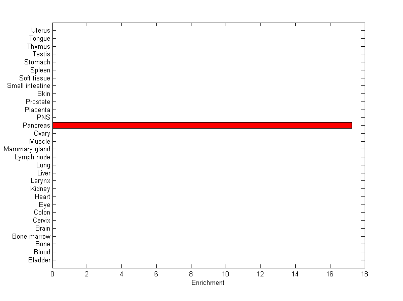 The expression level is normalized with tissue-library size. Each value for a gene in a tissue is a ratio of observed ESTs to the expected one in this tissue. The expected number of ESTs is the product of total ESTs of the gene and the fraction of total ESTs in the tissue among all ESTs in 30 tissues.