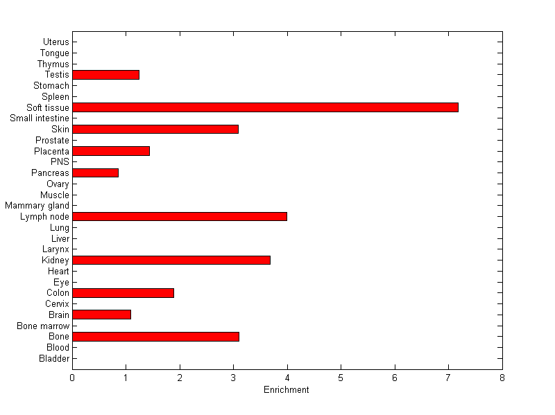 The expression level is normalized with tissue-library size. Each value for a gene in a tissue is a ratio of observed ESTs to the expected one in this tissue. The expected number of ESTs is the product of total ESTs of the gene and the fraction of total ESTs in the tissue among all ESTs in 30 tissues.