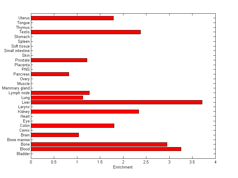 The expression level is normalized with tissue-library size. Each value for a gene in a tissue is a ratio of observed ESTs to the expected one in this tissue. The expected number of ESTs is the product of total ESTs of the gene and the fraction of total ESTs in the tissue among all ESTs in 30 tissues.