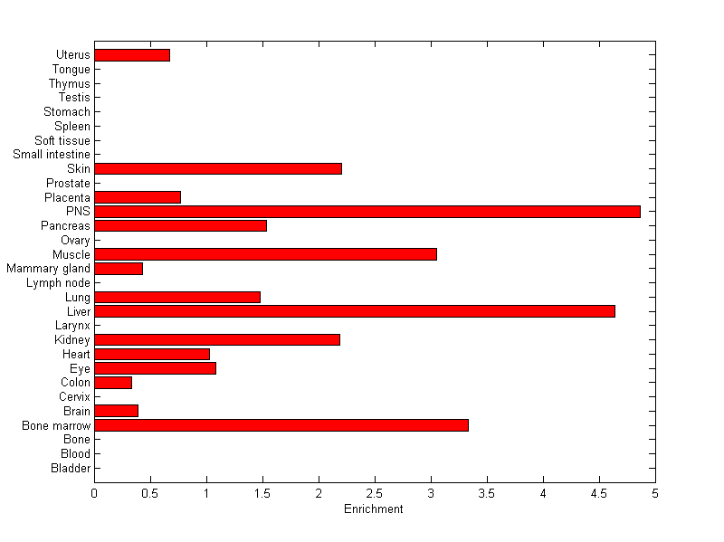 The expression level is normalized with tissue-library size. Each value for a gene in a tissue is a ratio of observed ESTs to the expected one in this tissue. The expected number of ESTs is the product of total ESTs of the gene and the fraction of total ESTs in the tissue among all ESTs in 30 tissues.