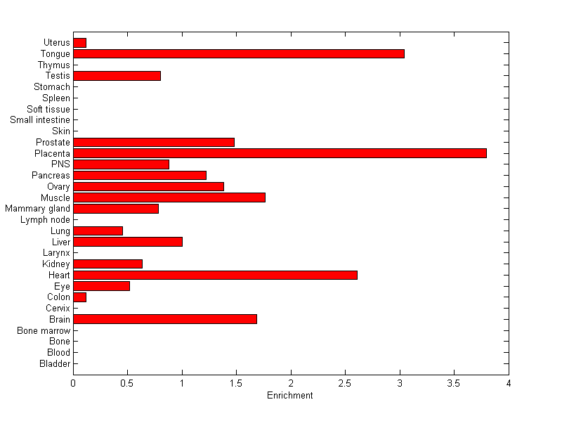 The expression level is normalized with tissue-library size. Each value for a gene in a tissue is a ratio of observed ESTs to the expected one in this tissue. The expected number of ESTs is the product of total ESTs of the gene and the fraction of total ESTs in the tissue among all ESTs in 30 tissues.