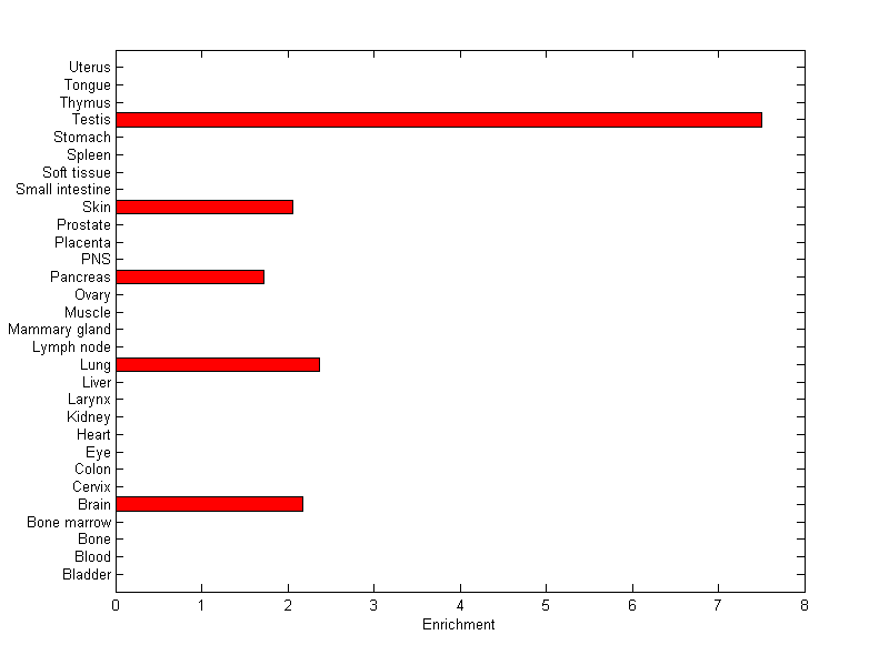 The expression level is normalized with tissue-library size. Each value for a gene in a tissue is a ratio of observed ESTs to the expected one in this tissue. The expected number of ESTs is the product of total ESTs of the gene and the fraction of total ESTs in the tissue among all ESTs in 30 tissues.