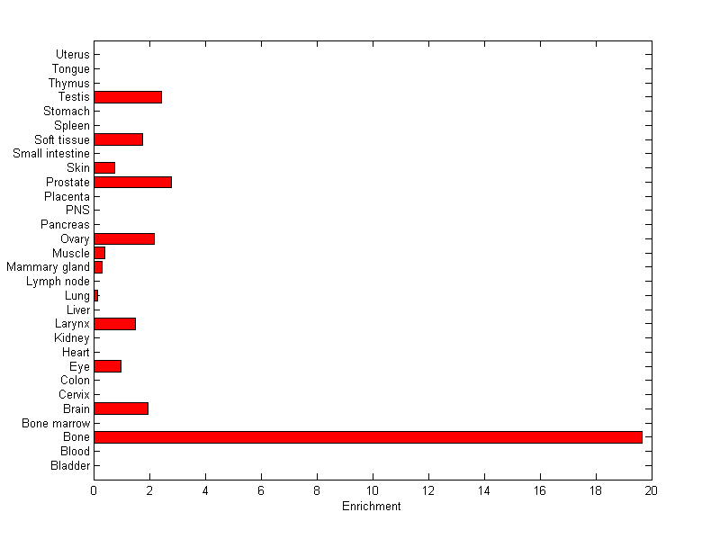 The expression level is normalized with tissue-library size. Each value for a gene in a tissue is a ratio of observed ESTs to the expected one in this tissue. The expected number of ESTs is the product of total ESTs of the gene and the fraction of total ESTs in the tissue among all ESTs in 30 tissues.