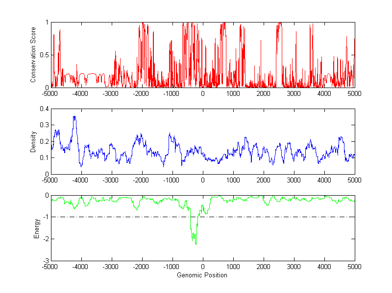 The energy profile (green curve) is about energy for module detection based on TF interaction. The positions with energy less than -1 indicate the existence of CRMs.