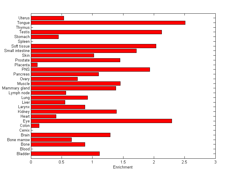 The expression level is normalized with tissue-library size. Each value for a gene in a tissue is a ratio of observed ESTs to the expected one in this tissue. The expected number of ESTs is the product of total ESTs of the gene and the fraction of total ESTs in the tissue among all ESTs in 30 tissues.