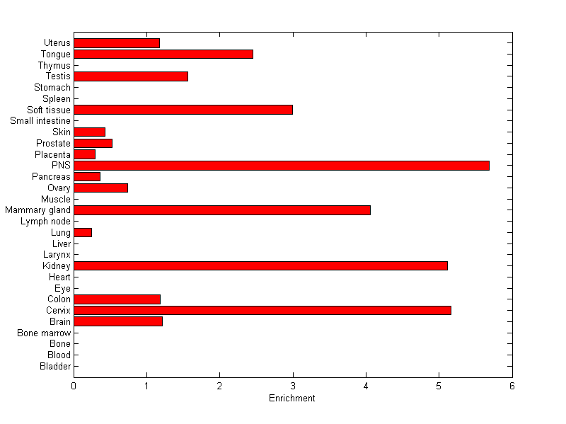 The expression level is normalized with tissue-library size. Each value for a gene in a tissue is a ratio of observed ESTs to the expected one in this tissue. The expected number of ESTs is the product of total ESTs of the gene and the fraction of total ESTs in the tissue among all ESTs in 30 tissues.
