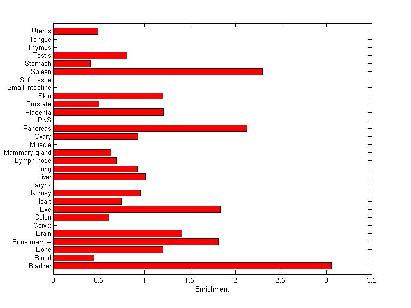 The expression level is normalized with tissue-library size. Each value for a gene in a tissue is a ratio of observed ESTs to the expected one in this tissue. The expected number of ESTs is the product of total ESTs of the gene and the fraction of total ESTs in the tissue among all ESTs in 30 tissues.