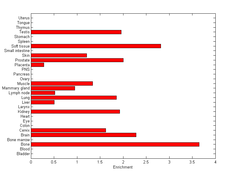 The expression level is normalized with tissue-library size. Each value for a gene in a tissue is a ratio of observed ESTs to the expected one in this tissue. The expected number of ESTs is the product of total ESTs of the gene and the fraction of total ESTs in the tissue among all ESTs in 30 tissues.