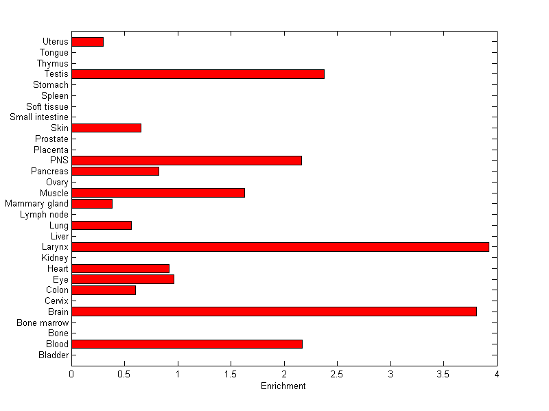 The expression level is normalized with tissue-library size. Each value for a gene in a tissue is a ratio of observed ESTs to the expected one in this tissue. The expected number of ESTs is the product of total ESTs of the gene and the fraction of total ESTs in the tissue among all ESTs in 30 tissues.
