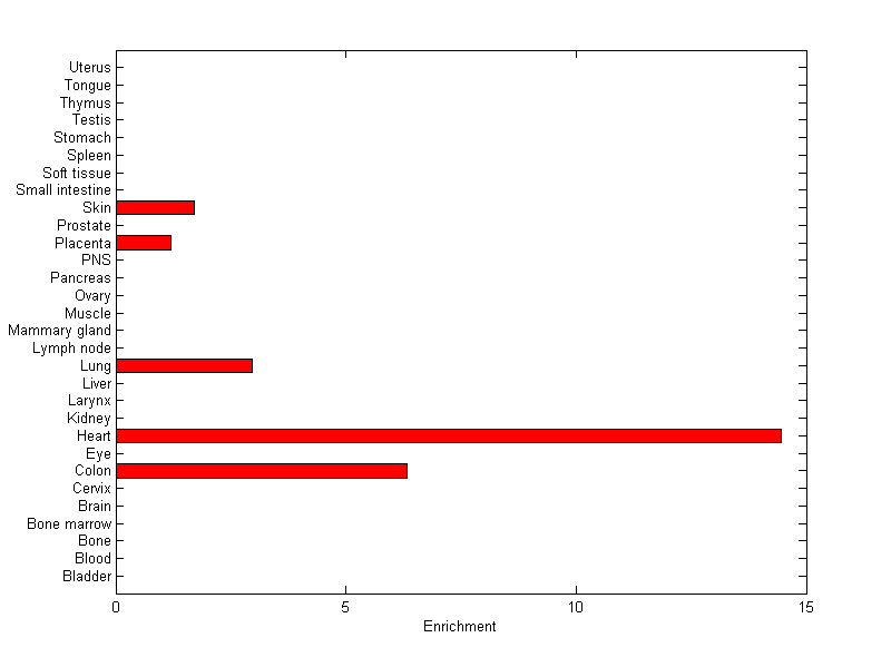 The expression level is normalized with tissue-library size. Each value for a gene in a tissue is a ratio of observed ESTs to the expected one in this tissue. The expected number of ESTs is the product of total ESTs of the gene and the fraction of total ESTs in the tissue among all ESTs in 30 tissues.
