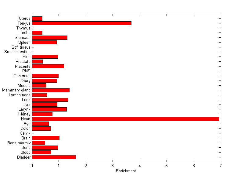 The expression level is normalized with tissue-library size. Each value for a gene in a tissue is a ratio of observed ESTs to the expected one in this tissue. The expected number of ESTs is the product of total ESTs of the gene and the fraction of total ESTs in the tissue among all ESTs in 30 tissues.