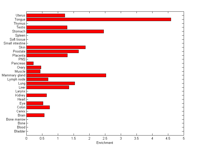 The expression level is normalized with tissue-library size. Each value for a gene in a tissue is a ratio of observed ESTs to the expected one in this tissue. The expected number of ESTs is the product of total ESTs of the gene and the fraction of total ESTs in the tissue among all ESTs in 30 tissues.