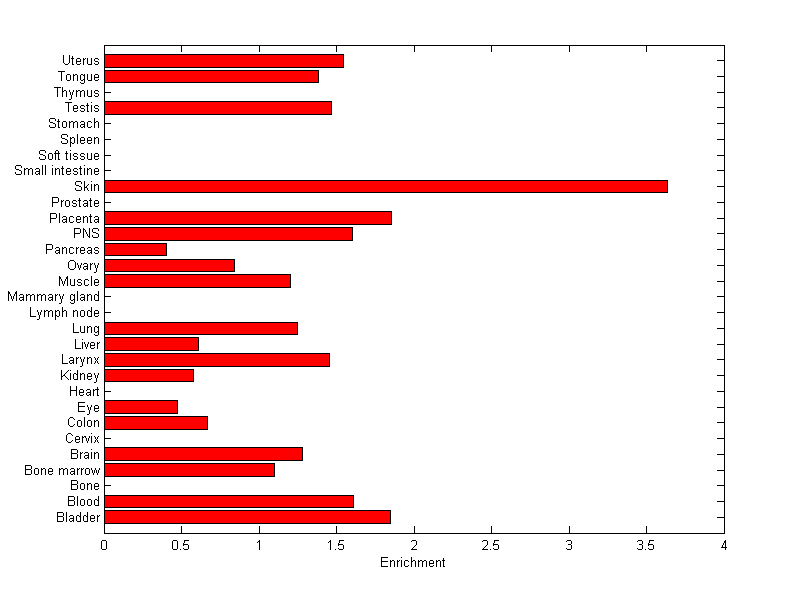 The expression level is normalized with tissue-library size. Each value for a gene in a tissue is a ratio of observed ESTs to the expected one in this tissue. The expected number of ESTs is the product of total ESTs of the gene and the fraction of total ESTs in the tissue among all ESTs in 30 tissues.
