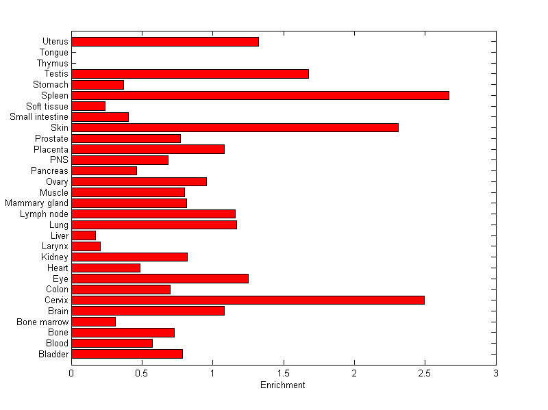 The expression level is normalized with tissue-library size. Each value for a gene in a tissue is a ratio of observed ESTs to the expected one in this tissue. The expected number of ESTs is the product of total ESTs of the gene and the fraction of total ESTs in the tissue among all ESTs in 30 tissues.