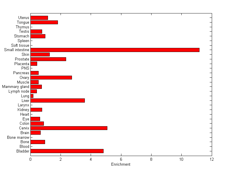 The expression level is normalized with tissue-library size. Each value for a gene in a tissue is a ratio of observed ESTs to the expected one in this tissue. The expected number of ESTs is the product of total ESTs of the gene and the fraction of total ESTs in the tissue among all ESTs in 30 tissues.