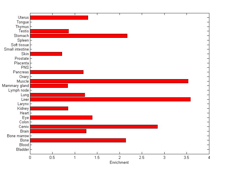 The expression level is normalized with tissue-library size. Each value for a gene in a tissue is a ratio of observed ESTs to the expected one in this tissue. The expected number of ESTs is the product of total ESTs of the gene and the fraction of total ESTs in the tissue among all ESTs in 30 tissues.