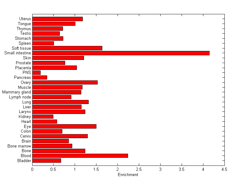 The expression level is normalized with tissue-library size. Each value for a gene in a tissue is a ratio of observed ESTs to the expected one in this tissue. The expected number of ESTs is the product of total ESTs of the gene and the fraction of total ESTs in the tissue among all ESTs in 30 tissues.