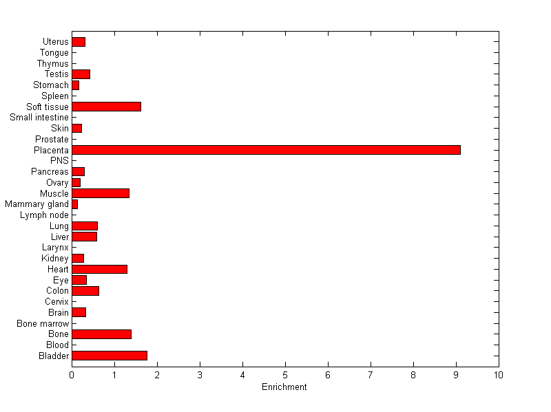 The expression level is normalized with tissue-library size. Each value for a gene in a tissue is a ratio of observed ESTs to the expected one in this tissue. The expected number of ESTs is the product of total ESTs of the gene and the fraction of total ESTs in the tissue among all ESTs in 30 tissues.