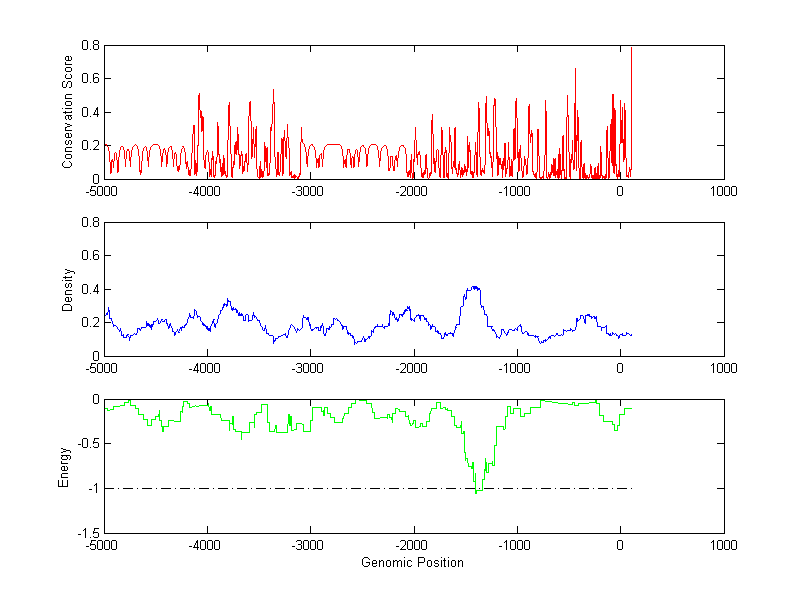 The energy profile (green curve) is about energy for module detection based on TF interaction. The positions with energy less than -1 indicate the existence of CRMs.