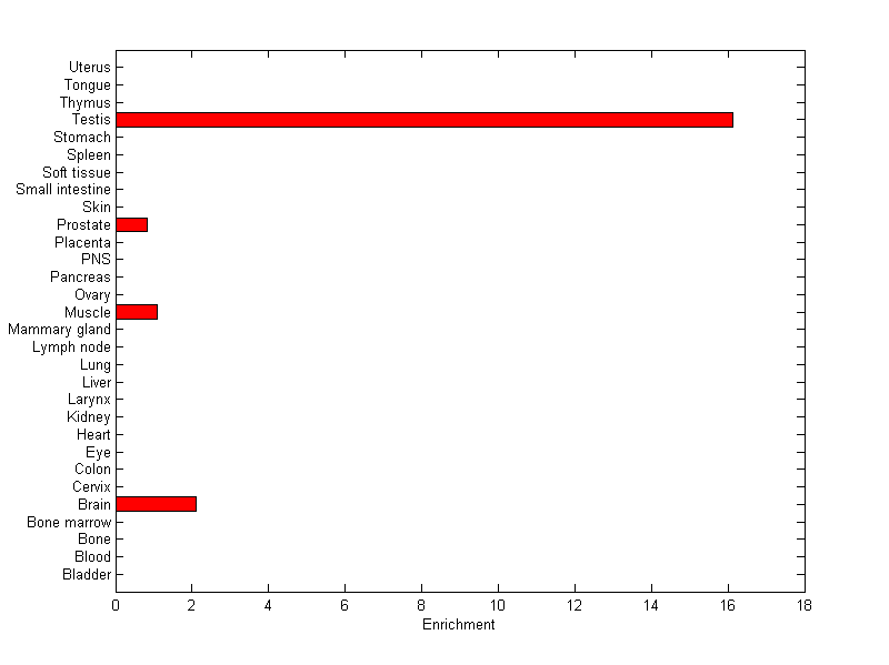 The expression level is normalized with tissue-library size. Each value for a gene in a tissue is a ratio of observed ESTs to the expected one in this tissue. The expected number of ESTs is the product of total ESTs of the gene and the fraction of total ESTs in the tissue among all ESTs in 30 tissues.