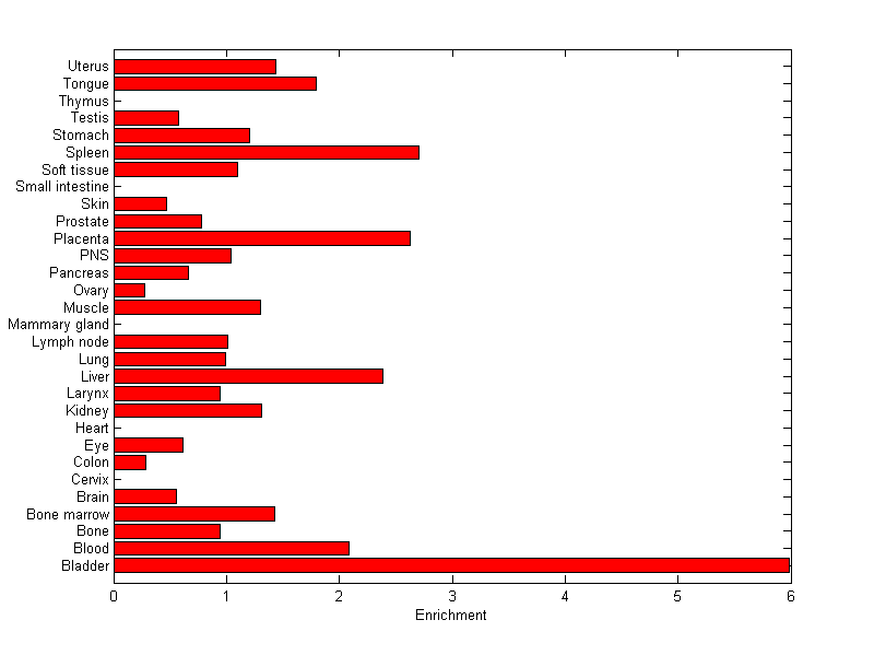 The expression level is normalized with tissue-library size. Each value for a gene in a tissue is a ratio of observed ESTs to the expected one in this tissue. The expected number of ESTs is the product of total ESTs of the gene and the fraction of total ESTs in the tissue among all ESTs in 30 tissues.