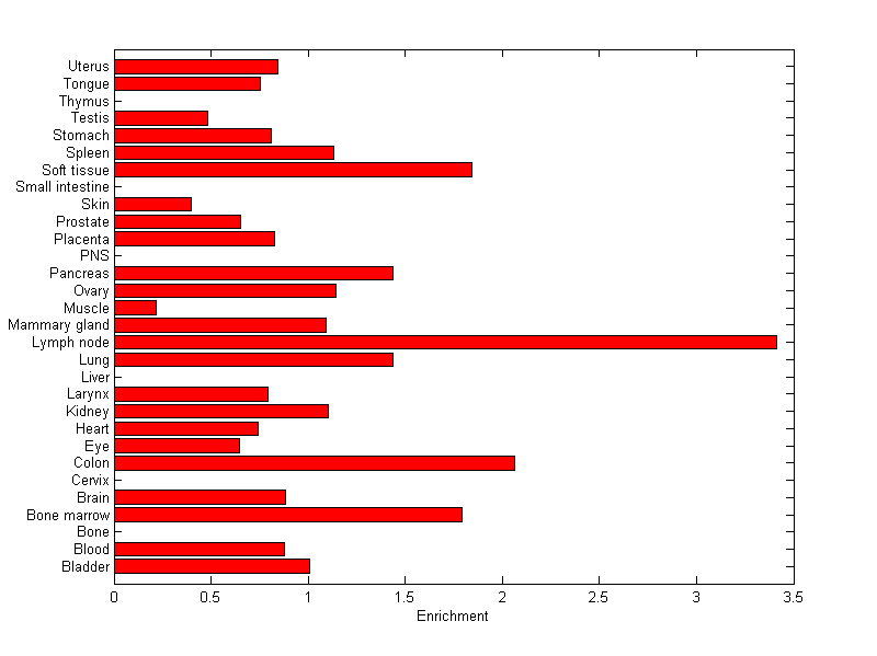 The expression level is normalized with tissue-library size. Each value for a gene in a tissue is a ratio of observed ESTs to the expected one in this tissue. The expected number of ESTs is the product of total ESTs of the gene and the fraction of total ESTs in the tissue among all ESTs in 30 tissues.