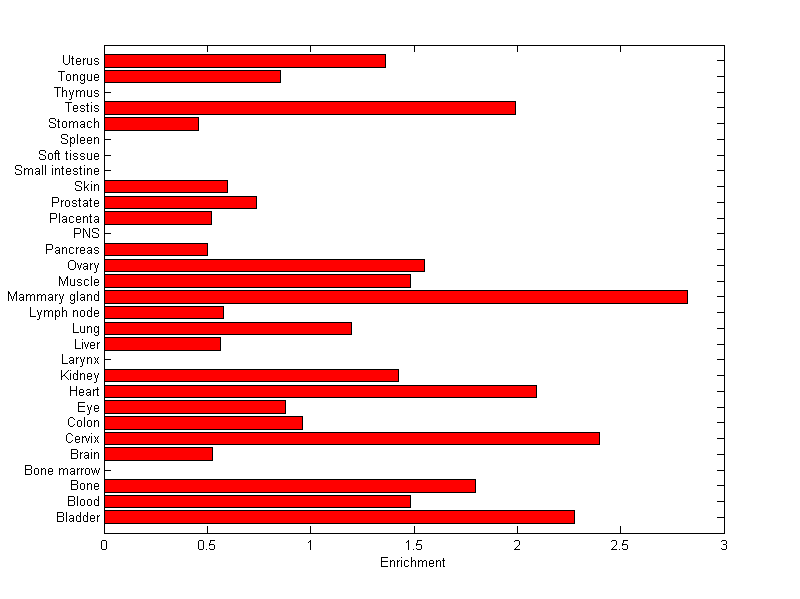 The expression level is normalized with tissue-library size. Each value for a gene in a tissue is a ratio of observed ESTs to the expected one in this tissue. The expected number of ESTs is the product of total ESTs of the gene and the fraction of total ESTs in the tissue among all ESTs in 30 tissues.