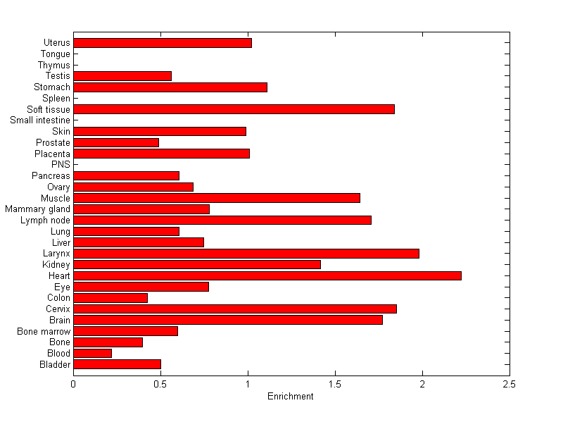 The expression level is normalized with tissue-library size. Each value for a gene in a tissue is a ratio of observed ESTs to the expected one in this tissue. The expected number of ESTs is the product of total ESTs of the gene and the fraction of total ESTs in the tissue among all ESTs in 30 tissues.