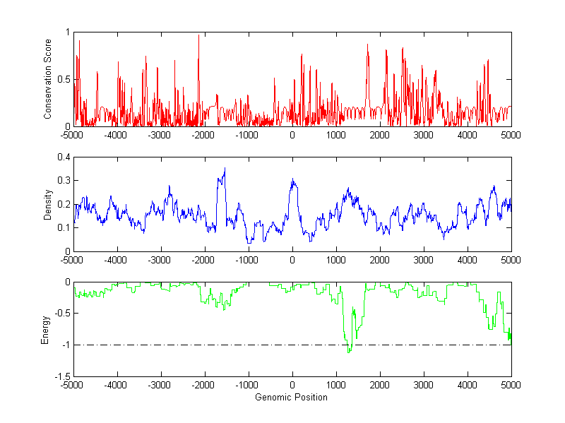 About the profiles: The conservation profile (red curve) is about conservation scores of the promoter sequences. Conservation was determined from an eight-way alignment of human, chimpanzee, dog, mouse, rat, chicken, zebrafish and fugu sequences. The conservation was quantified by a conservation score between 0 and 1, with 1 as highest conservation. The conservation score was obtained from UCSC genome databases. The density profile (blue curve) is about density of all TF binding sites. The energy profile (green curve) is about energy for module detection based on TF interaction. The positions with energy less than -1 indicate the existence of CRMs. Download: Conservation profileDensity profile Energy profile CRM summary |