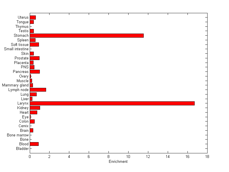 About the profile: The expression level is normalized with tissue-library size. Each value for a gene in a tissue is a ratio of observed ESTs to the expected one in this tissue. The expected number of ESTs is the product of total ESTs of the gene and the fraction of total ESTs in the tissue among all ESTs in 30 tissues. Summary: This gene is preferentially expressed in [larynx, stomach] Download: |