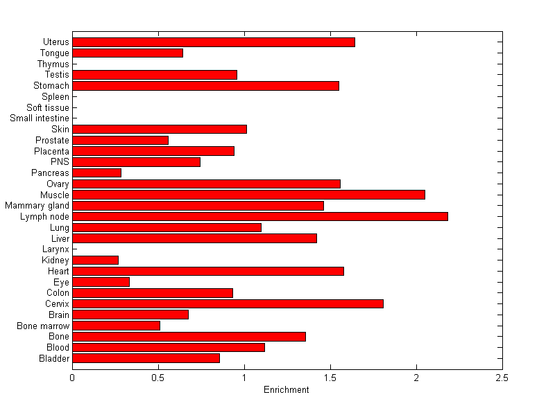 The expression level is normalized with tissue-library size. Each value for a gene in a tissue is a ratio of observed ESTs to the expected one in this tissue. The expected number of ESTs is the product of total ESTs of the gene and the fraction of total ESTs in the tissue among all ESTs in 30 tissues.