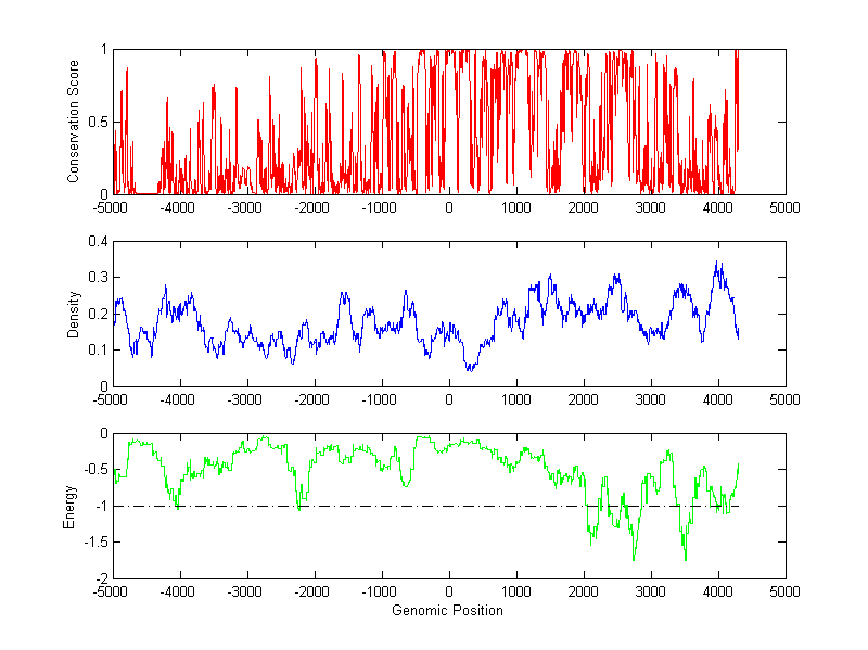 The energy profile (green curve) is about energy for module detection based on TF interaction. The positions with energy less than -1 indicate the existence of CRMs.