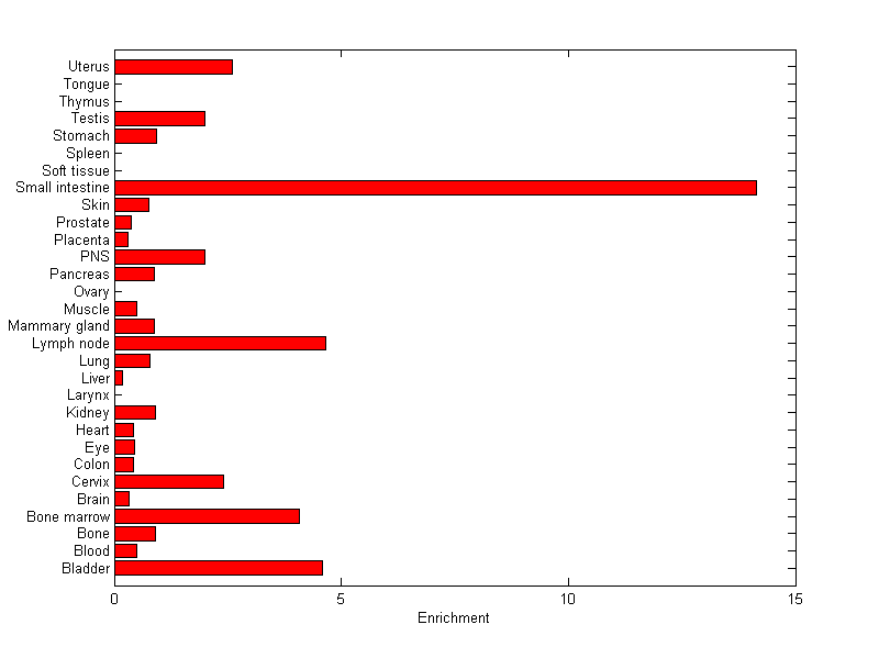 The expression level is normalized with tissue-library size. Each value for a gene in a tissue is a ratio of observed ESTs to the expected one in this tissue. The expected number of ESTs is the product of total ESTs of the gene and the fraction of total ESTs in the tissue among all ESTs in 30 tissues.