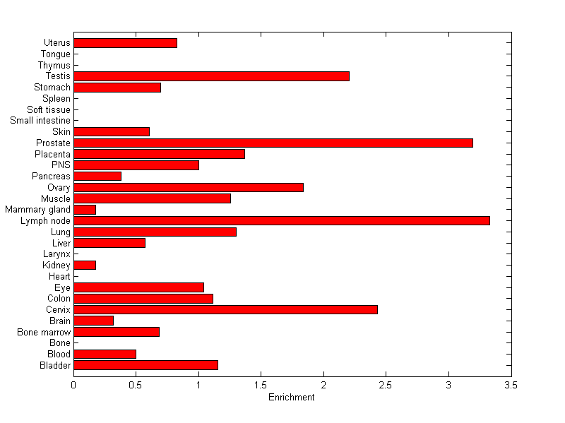 The expression level is normalized with tissue-library size. Each value for a gene in a tissue is a ratio of observed ESTs to the expected one in this tissue. The expected number of ESTs is the product of total ESTs of the gene and the fraction of total ESTs in the tissue among all ESTs in 30 tissues.