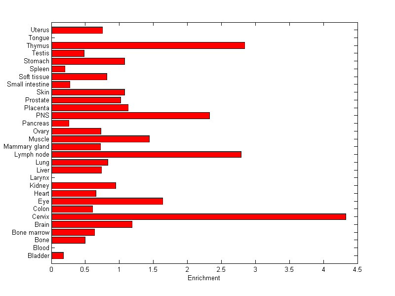 The expression level is normalized with tissue-library size. Each value for a gene in a tissue is a ratio of observed ESTs to the expected one in this tissue. The expected number of ESTs is the product of total ESTs of the gene and the fraction of total ESTs in the tissue among all ESTs in 30 tissues.