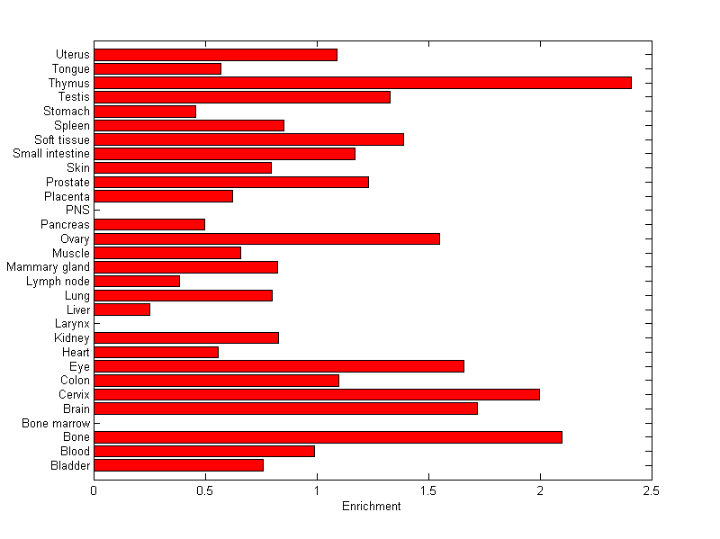 The expression level is normalized with tissue-library size. Each value for a gene in a tissue is a ratio of observed ESTs to the expected one in this tissue. The expected number of ESTs is the product of total ESTs of the gene and the fraction of total ESTs in the tissue among all ESTs in 30 tissues.