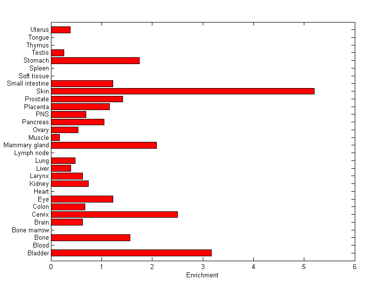 The expression level is normalized with tissue-library size. Each value for a gene in a tissue is a ratio of observed ESTs to the expected one in this tissue. The expected number of ESTs is the product of total ESTs of the gene and the fraction of total ESTs in the tissue among all ESTs in 30 tissues.