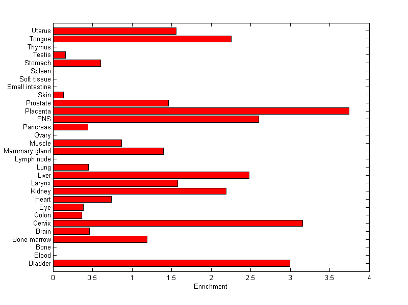 The expression level is normalized with tissue-library size. Each value for a gene in a tissue is a ratio of observed ESTs to the expected one in this tissue. The expected number of ESTs is the product of total ESTs of the gene and the fraction of total ESTs in the tissue among all ESTs in 30 tissues.