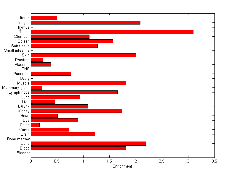 The expression level is normalized with tissue-library size. Each value for a gene in a tissue is a ratio of observed ESTs to the expected one in this tissue. The expected number of ESTs is the product of total ESTs of the gene and the fraction of total ESTs in the tissue among all ESTs in 30 tissues.